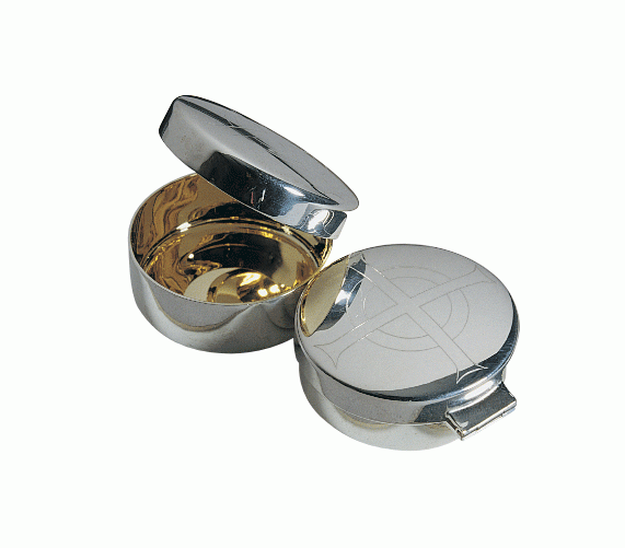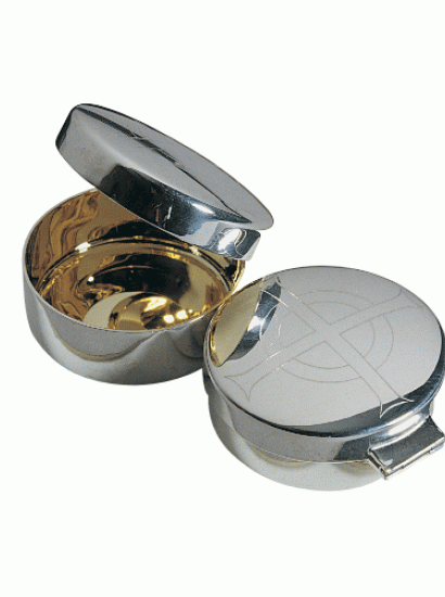 Hinged Pyx S/P CODE: SW15H Hinged Pyx S/P Engraved with a cross design and gilded 1 3/4" Diameter Holds 10 wafers € 150.00 Enter Quantity -+
